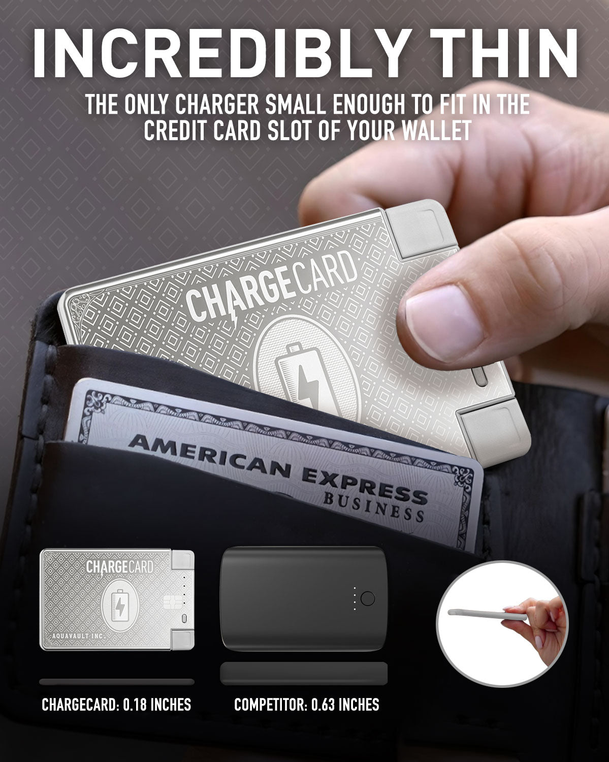 - The ChargeCard is a Credit-Card-Size Portable Charger that actually fits in your wallet (Most likely the smallest charger you have ever seen)