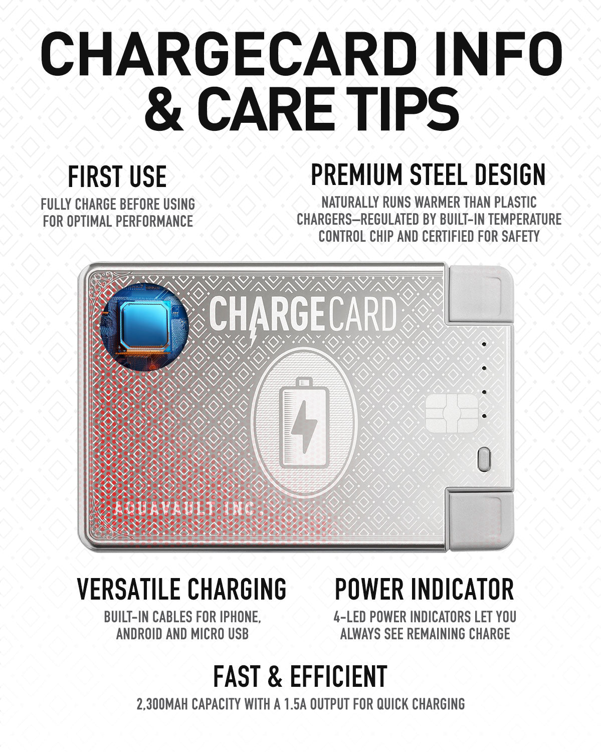 Proper care Instructions: Please read the instructions inside the box to fully understand how to properly use the ChargeCard which also includes what not to do.